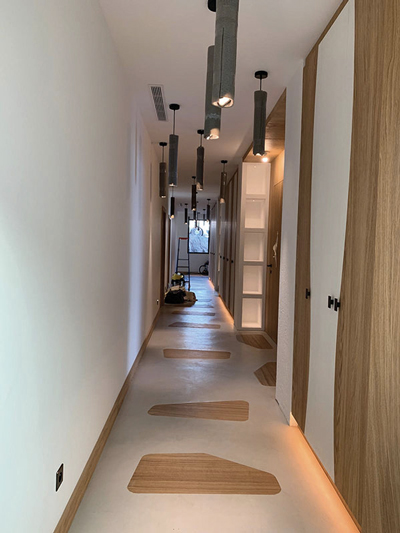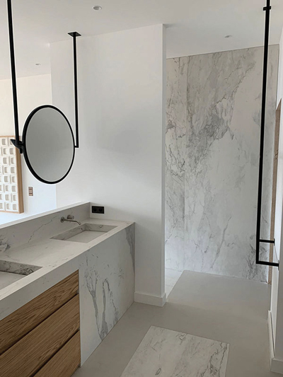 L’accompagnement de l’entreprise de carrelage a aussi porté sur certains aspects techniques, concernant notamment « la faisabilité de la pose selon la destination des ouvrages », précise Anthony Frizot. Pour répondre aux attentes réglementaires en matière de performances thermiques, le carreleur est intervenu en intérieur avec un isolant en mousse de polyuréthane projeté recouverte d’une chape fluide ciment, avant de coller les différents revêtements de sols. À un détail près : le couloir en béton ciré, rythmé par des pas japonais en bois massif. Cette technique non courante a été validée par le maître d’ouvrage et le maître d’œuvre. « Ces matériaux n’étant pas visés comme revêtement dans nos textes de référence, nous les avons informés des évolutions possibles de l’ouvrage telles que l’apparition de microfissures », ajoute le gérant de Procarl, en précisant : « Dans ces villas exceptionnelles, nous faisons, au cas par cas, des mises en œuvre spécifiques. » Pour cette exécution sous haute protection du matériau naturel, une fois la chape réalisée de niveau, des gabarits ont été préparés avant d’appliquer un ragréage, « afin de laisser 3 à 4 mm maximum de finition sur la chape. Les pièces finales en bois ont ensuite été posées, puis traitées avant d’être calfeutrées pour réaliser l’application du béton ciré en plusieurs couches. Une fois la patine de finition faite, la protection du bois a été ôtée ». Le procédé de béton ciré, avec de la pierre à la place du bois, a été reproduit dans l’une des salles de bains.