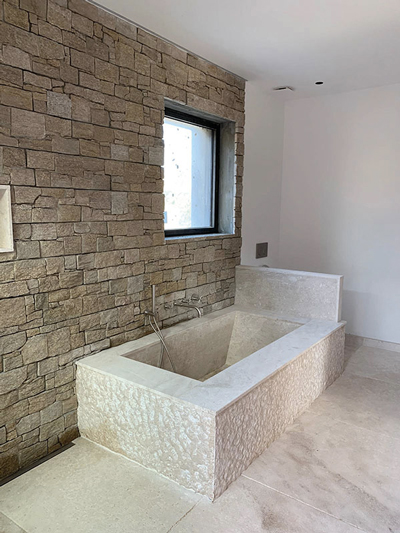 « Je crois que c’est une des plus grandes dimensions qui existe, en 6 mm d’épaisseur seulement. Depuis longtemps, nous utilisons régulièrement de très grands formats, et nos compagnons ont suivi des formations avant de les mettre en œuvre », précise le chef d’entreprise. La pierre naturelle, matériau noble par excellence, n’est pas en reste dans cette villa de prestige. Elle pare en 80 × 80 cm le sol des chambres, de la cuisine et du salon. Elle grimpe aux murs des salles de bains sous forme de parement, et enchâsse un tablier de baignoire maçonné en alternance avec une finition martelée.