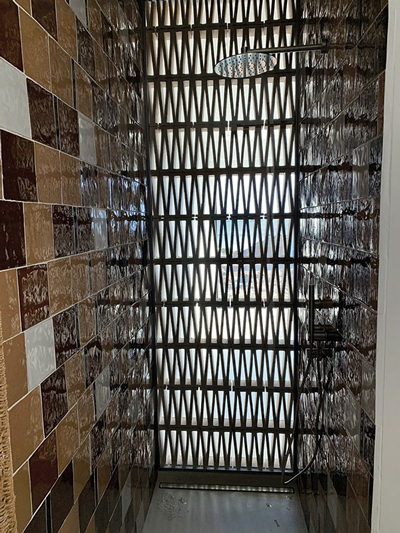 Pour répondre au cahier des charges précis rédigé par la maîtrise d’œuvre, « nous avons conseillé le mélange de matériaux, parfois atypiques, en collaboration avec notre fournisseur et partenaire LCA Méditerranée à Porto-Vecchio, qui est un grand spécialiste de la céramique et de la pierre, continue Anthony Frizot. De manière générale, nous apprécions le tempo des architectes et des décorateurs d’intérieur, qui ont apporté dans cette villa un thème précis à chaque chambre avec salle de bains. Ce chantier est l’expression de toute l’esthétique des matériaux qui constituent notre savoir-faire. » À l’instar de ce moucharabieh qui ajoure le mur de douche de l’une des salles de bains, laissant deviner la vue magistrale : il a été façonné par Procarl avec la collection en terre cuite Celosia, griffée par l’architecte et designeuse espagnole Patricia Urquiola pour Mutina. Remarquable aussi, cette plaque murale en Kerlite, un grès cérame ultrafin et bas carbone, de 160 × 320 cm.