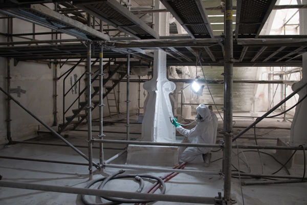 La mise en œuvre des 60t de peinture vert réséda, sur les quelque 8.000m2 de surface concernée, a été tout aussi exigeante : la reproduction de la couleur d’origine a été obtenue grâce à une recherche stratigraphique, et avec un spectrocolorimètre portatif, afin de mettre au point, en collaboration avec le fabricant de peinture, une teinte similaire permettant de ne pas voir de démarcation entre les zones restaurées et conservées.