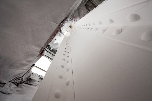 Ce chantier comprend un important volet « hygiène, sécurité, environnement (HSE) », avec notamment le traitement des peintures au plomb, que nous avons décapées par projection d’abrasif, en prenant toutes les mesures de confinement et de renouvellement d’air nécessaires à la protection des compagnons et de l’environnement. Nous avons aussi réduit au minimum les nuisances sonores par l’utilisation de bâches acoustiques et de matériel électrique.