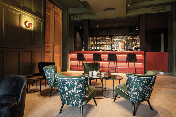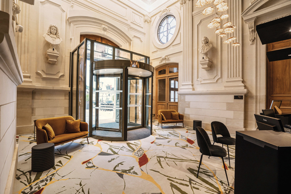 Dès la réception, le ton est donné : plusieurs bustes d’anciens magistrats, auparavant situés à l’extérieur, veillent sur l’hôtel, sous la lumière de suspensions dorées modernes. Pour restaurer sans le dénaturer ce patrimoine d’exception, il a d’abord fallu effacer les traces d’une décennie de fermeture et de dégradation : boiseries attaquées par les mérules à déposer, plâtre à repiquer entièrement… La façade riche en modénatures, érigée en tuffeau – une pierre massive locale – et en épaisseur de 60 cm, a dû être retaillée au niveau des corniches et des lucarnes. En certains endroits, elle a aussi subi des refouillements pour y loger des pierres neuves sur quelques centimètres d’épaisseur. Performance thermique oblige, des doubles vitrages sont venus équiper les fenêtres par creusement des feuillures existantes.