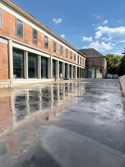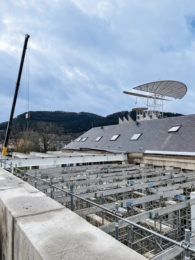 Autres opérations réalisées, le creusement d’un sous-sol destiné aux archives, avec la réalisation d’un cuvelage pour assurer son étanchéité, et l’ajout à l’extrémité du bâtiment d’un volume de 12 m linéaires en structure métallique suspendue avec toit-terrasse.