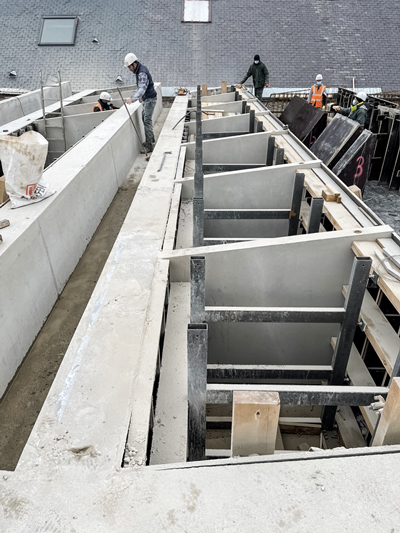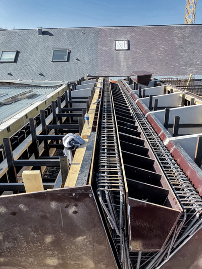 « Pour réaliser cet ouvrage exceptionnel, la méthode que nous avons suivie a été de préfabriquer les poutres intercalaires, de les positionner depuis un platelage, puis de les liaisonner avec chaque grande poutre, coffrée, ferraillée et coulée en place l’une après l’autre, explique Xavier Dorado, dirigeant de Batico 88. L’extrémité basse du V ne faisant que 15 cm, nous avons utilisé et mis en oeuvre avec soin un béton autoplaçant, pour obtenir le rendu architectonique final. »
