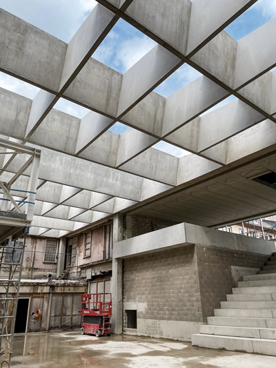Les travaux commencent par la démolition d’un bâtiment sans relief situé au centre du site pour faire place nette et par un renforcement des planchers existants, grâce à l’utilisation de plats carbone et de structures métalliques, en prenant soin de respecter les façades de cet édifice labellisé « Patrimoine du xxe siècle ».