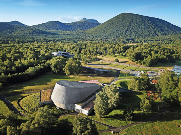 Dans ce sillage, le planétarium prend la forme d’un bâtiment-paysage partiellement enterré, composé d’un socle tectonique de béton brut, sur lequel repose une lentille tronquée en construction métallique, abritant l’écran panoramique, dont le profil rappelle celui des volcans environnants.