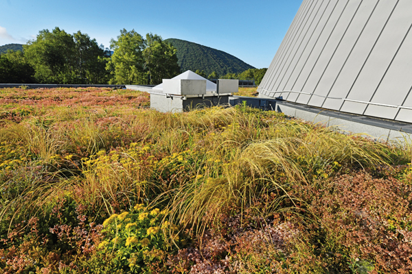 « Compte tenu de l’altitude et du climat de montagne, nous avons réalisé sur la dalle béton un pare-vapeur renforcé, suivi d’une couche d’isolant conventionnel de 100 mm, puis d’une deuxième couche d’isolant traité anti-racines de 100 mm, auxquelles s’ajoutent une couche de drainage de 40 mm et, pour finir, une couche de 30 mm de substrat », détaille Jean-Marc Seccaud, directeur de l’agence de Clermont-Ferrand.