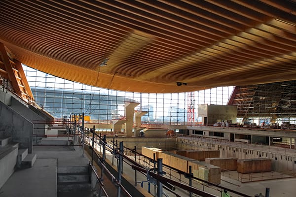 L’immense couverture de 11.000 m2 du Centre aquatique, mise en œuvre sur la nappe mouvante composée de catènes, avec des parties en pente jusqu’à 38 %, a constitué à elle seule un chantier très complexe, nécessitant également une ATEx.