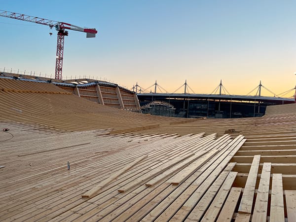 L’entreprise a en effet réalisé dans le Village des athlètes, sur la commune de Saint-Ouen (Seine-Saint-Denis), un immeuble en R+7 à structure en poteaux-poutres en épicéa et douglas, de 37 m de haut et 14 000 m2, dont la particularité est de comporter au 7e niveau un gymnase consacré aux entraînements de basket. Non loin de là, elle a aussi construit une passerelle de 100 m de long, composée de poutres en lamellé-collé de 50 m de portée libre reposant sur des piliers en béton, qui enjambe l’autoroute A1 au niveau du Bourget.