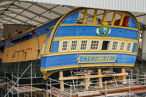 10:1605/03/2025Avec ses 44,20 m de longueur de coque et son déplacement de 1 250 t, L’Hermione, actuellement en cale sèche dans le port de Bayonne (Pyrénées-Atlantiques), impressionne les visiteurs. Mais elle n’est pas encore prête à reprendre la mer.