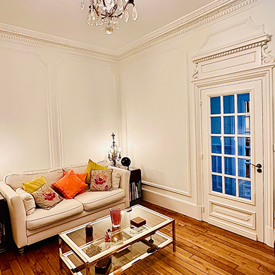 7:0410/06/2025Cette maison ancienne, construite au début du xxe siècle, a vu sa décoration complètement rénovée, tout en conservant son âme. Comme cela se faisait à l’époque, cet intérieur se caractérisait par une riche ornementation classique, avec des moulures, des corniches, des trumeaux de cheminée sculptés, traités dans un réchampis bleu et gris, dialoguant avec des revêtements de sol à base de carreaux de ciment et de bois, ce qui donnait un ensemble assez chargé.