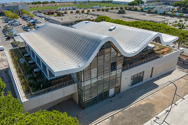 7:0710/06/2025Spécialiste de l’enveloppe des bâtiments et de la construction de charpentes, Soprema Entreprises a réalisé au Grau-du-Roi un chantier hors norme : la couverture et l’étanchéité d’un bâtiment iconique coiffé d’une toiture en forme de vague dont les pentes sont comprises entre 50 % et 150 %. Étancheurs et compagnons ont notamment posé 2 km de profils pyramidaux, une solution plus aisée à mettre en place que les classiques feuilles de zinc.