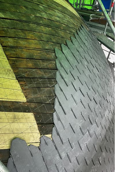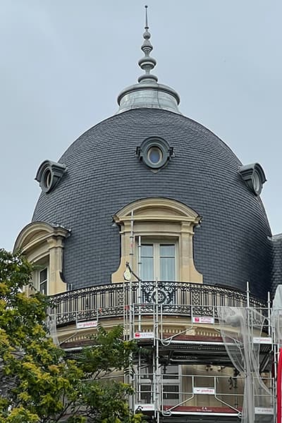 « Cette toiture comporte un dôme impérial que nous avons entièrement restauré, explique Freddy Savignard, son dirigeant. Après avoir déposé les ardoises rongées par la pyrite, qui risquaient d’éclater, nous avons remplacé les pièces défectueuses du support de couverture en bois de peuplier, puis recouvert celui-ci avec des ardoises neuves de format 18 27 et d’épaisseur de 3 mm, taillées puis posées au crochet inox teinté noir. » Le brisis en ardoise a été complété avec une noue ronde fermée.