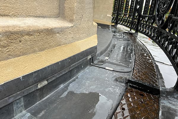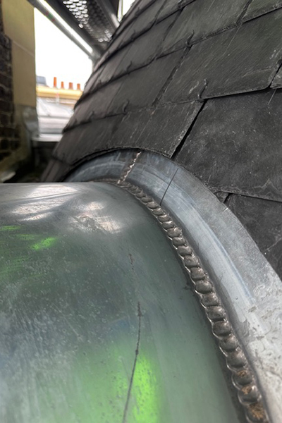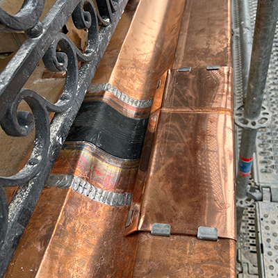 L’entreprise a également réalisé des ouvrages de couverture en plomb, et notamment un recouvrement cintré sur le balcon accessible de la rotonde ainsi que des chéneaux en cuivre sur mesure, soudés à l’étain, au droit des balcons du cinquième étage.