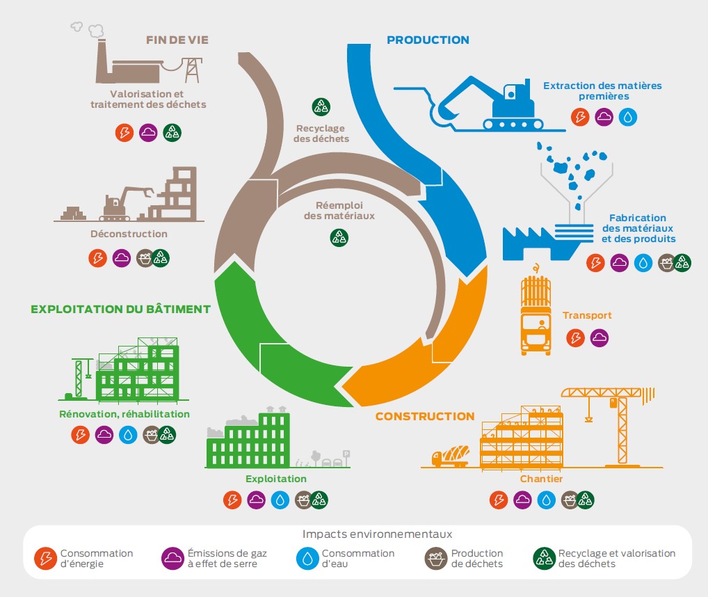 Dans son principe, l’ACV prend en compte un grand nombre d’impacts sur l’environnement, qui concernent notamment les ressources, le changement climatique, les déchets et la qualité des écosystèmes. Dans le bâtiment, le calcul de l’ACV a été rendu obligatoire par l’entrée en vigueur de la RE 2020, en se focalisant uniquement sur l’indicateur « changement climatique », autrement dit les émissions carbone générées pendant toute la durée de vie du bâtiment.