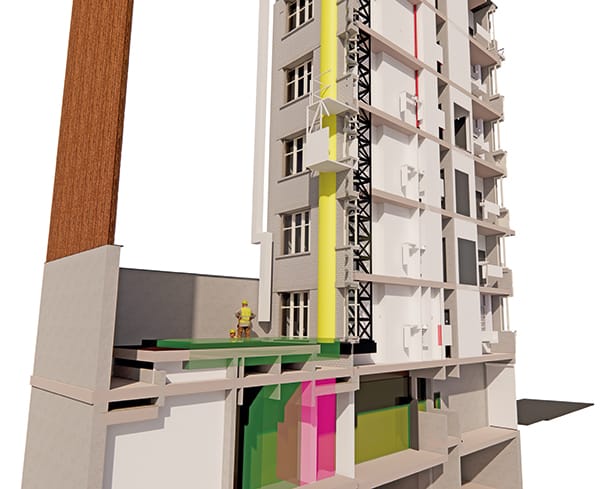 Bien plus que la simple représentation d’un espace, cette maquette qui contient toutes les informations du projet est une véritable réplique numérique du bâtiment réel. « La maquette numérique a été réalisée avant le démarrage des travaux à partir des plans existants et des mesures effectuées sur place, ce qui est rare dans l’ancien. C’était plus simple de partir d’un bâtiment déjà modélisé : cela permet d’avoir une vue en 3D de toute la structure métallique et de la structure porteuse de l’immeuble, de l’emplacement des différents réseaux…