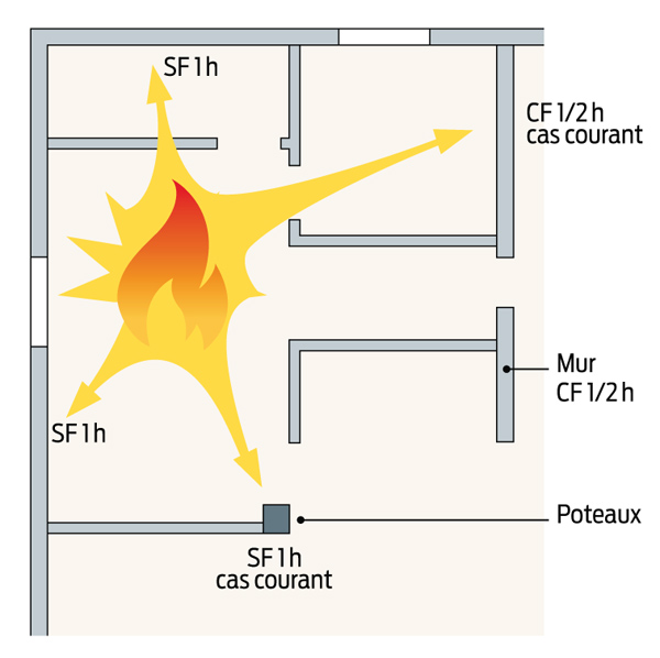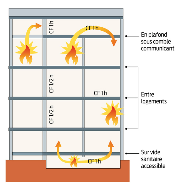 La résistance au feu des parois d'isolement entre logements contigus fait l'objet d'exigences croissantes selon le classement du bâtiment — de la 1re à la 4e famille — qui dépend lui-même de sa hauteur. Ainsi, les parois séparatives des habitations individuelles des 1re et 2e familles jumelées ou réunies en bande doivent être coupe-feu de degré 1/4 h.