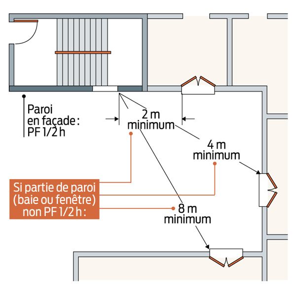 Dans toutes les habitations collectives, en règle générale, les parois d'escalier doivent être pare-flammes de degré 1/2 h. Les parties de parois, baies ou fenêtres non pare-flammes de degré 1/2 h doivent être situées :